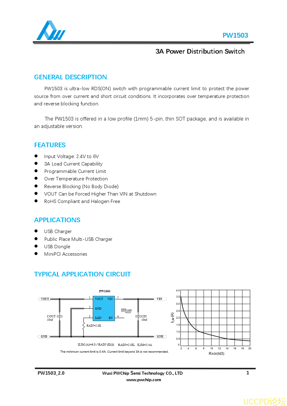 PW1503 is ultra-low RDS(ON) switch with programmable current limit to protect the power