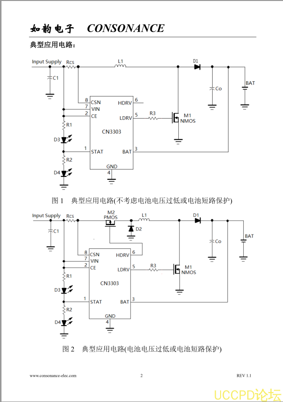 当接通输入电源后,CN3303进入充电状态,控制片外N沟道MOSFET导通,电感电流上升,当上升到外部电流检测电阻设置的上限时,片外N沟道MOSFET截止,电感电流下降,电感中的能量转移到电池中。当电感电流下降到外部电流检测电阻设置的下限时,片外N沟道MOSFET再次导通,如此循环。当BAT管脚电压第一次达到内部设置的12.6V(典型值)时,CN3303进入准充电模式,以较小电流对电池充电。只有当BAT管脚电压第二次达到12.6V时,充电过程才结束,片外N沟道MOSFET保持截止状态。当BAT管脚电压下降到再充电阈值时,CN3303再次进入充电状态。CN3303最高工作频率可达1MHz,工作温度范围从-40℃到+85℃。