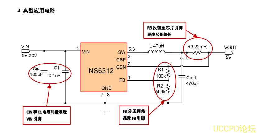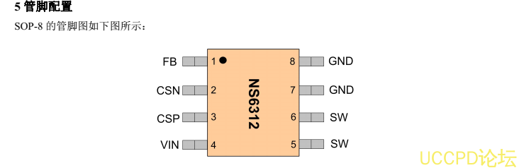 NS6312 内置线电压补偿,可通过调节 FB 端口的分压电阻阻值来实现。NS6312 不仅可实现单芯片降压电源管理方案,还可以与 QC2.0/ QC3.0 识别芯片构成快速充电电源管理方案。另外,芯片包含多重保护功能:过温保护,输出短路保护和输入欠压/过压保护等。