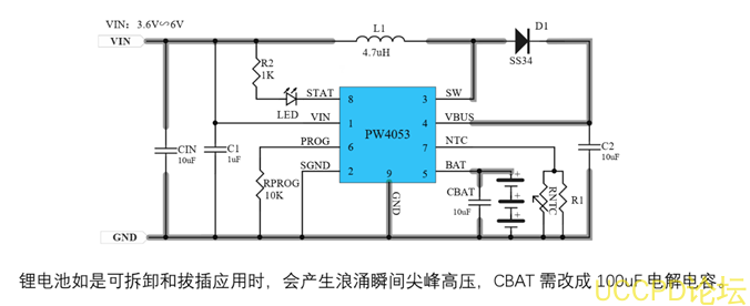 PW4053,输入 5V,升压输出 12.6V的三节锂电池充电管理芯片, 1A;