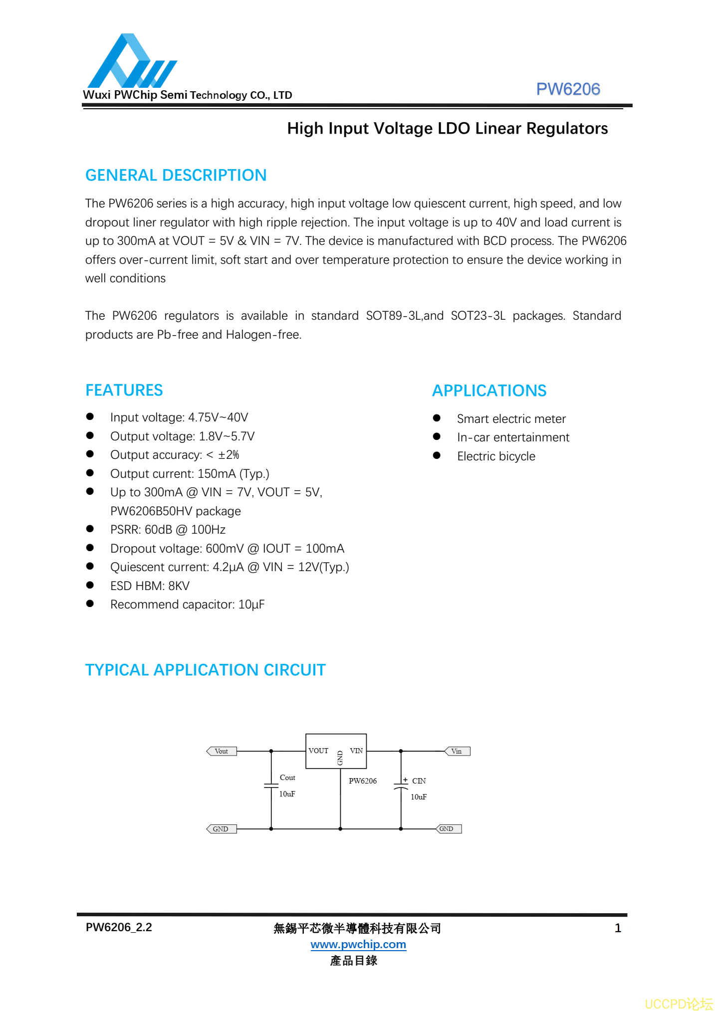 The PW6206 series is a high accuracy, high input voltage low quiescent current, high speed, and low dropout liner regulator with high ripple rejection. The input voltage is up to 40V and load current is up to 300mA at VOUT = 5V & VIN = 7V. The device is manufactured with BCD process. The PW6206 offers over-current limit, soft start and over temperature protection to ensure the device working in well conditions
