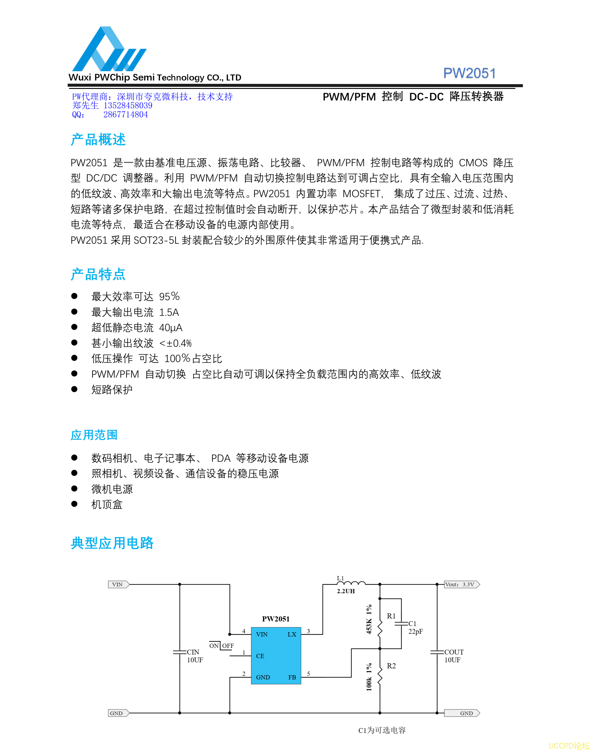 (AS11D)PW2051 是一款由基准电压源、振荡电路、比较器、 PWM/PFM 控制电路等构成的 CMOS 降压型 DC/DC 调整器。利用 PWM/PFM 自动切换控制电路达到可调占空比,具有全输入电压范围内的低纹波、高效率和大输出电流等特点。 PW2051 AS11D )内置功率 MOSFET, 集成了过压、过流、过热、短路等诸多保护电路,在超过控制值时会自动断开,以保护芯片。本产品结合了微型封装和低消耗电流等特点,最适合在移动设备的电源内部使用。 PW2051 AS11D )最大输出电流 1.5A,超高效率 95%。
