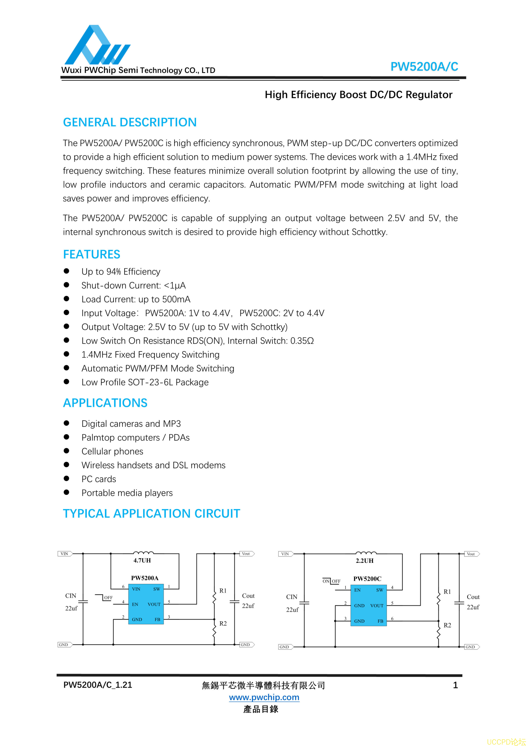 PW5200A是一款高效率的同步PWM升压型DC/DC变换器解决方案。PW5200A工作频率为1.4MHZ。轻载时自动PWM/PFM模式切换,提高效率。PW5200A/能够提供2.5V和5V之间的输出电压内部同步整流开关,节省了肖特基的情况下提高了效率。