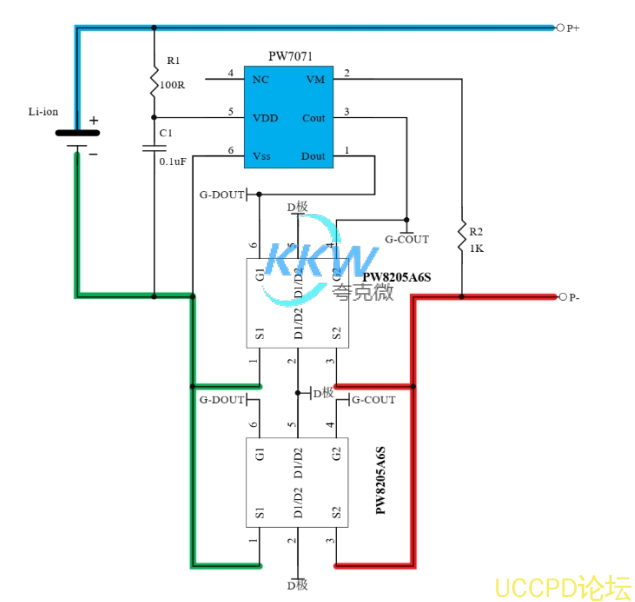 PW7071 单串锂电池得过充,过放,过流检测保护电路芯片,并联 MOS 可增加过流保护值。