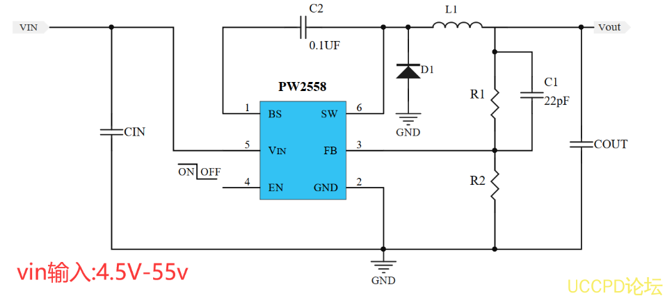 PW2558是一顆 DC-DC降壓轉換器芯片,輸入電壓範圍 4.5V-55V,最大負載電流 0.8A,可調輸齣電壓,頻率 1.2MHZ高頻率,可採用貼片電感,節省空間,採用 SOT23-6封裝形式。