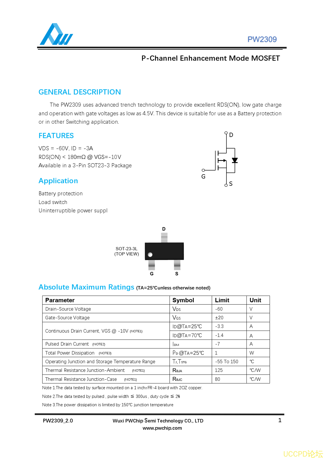 The PW2309 uses advanced trench technology to provide excellent RDS(ON), low gate charge