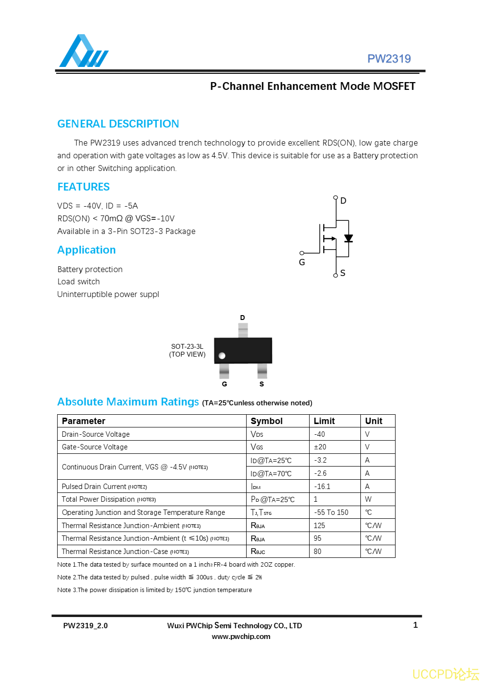 The PW2319 uses advanced trench technology to provide excellent RDS(ON), low gate charge