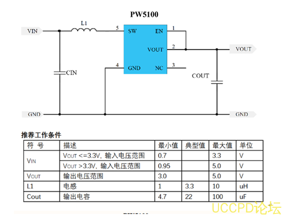 PW5100輸入電壓範圍 0.7V-5V,輸齣固定電壓: 3V, 3.3V, 5V,效率最高 95%,低功耗 10Ua,芯片開關電路 1.5A,封裝 SOT23-5,電感採用 1uh-10uh。