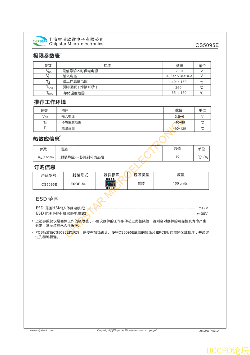 CS5095E提供瞭纖小的ESOP8L封裝類型, 供客戶選擇,其額定的工作溫度範圍爲-40℃至85℃,