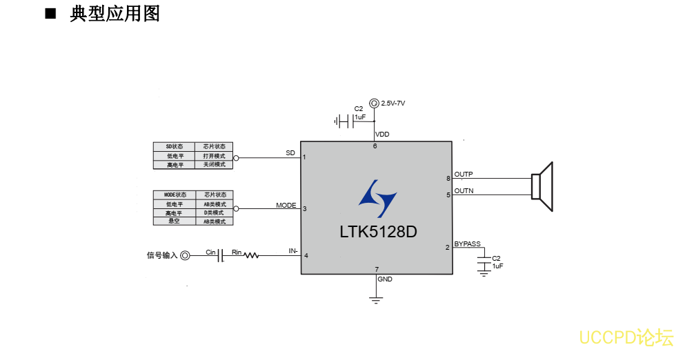 LTK5128D 的工作電壓範圍爲 2.5-7V。在 D 類放大器模式下可以提供高於 90%的效率,新型的無濾波器結構可以省去傳統 D 類放大器的輸低通濾