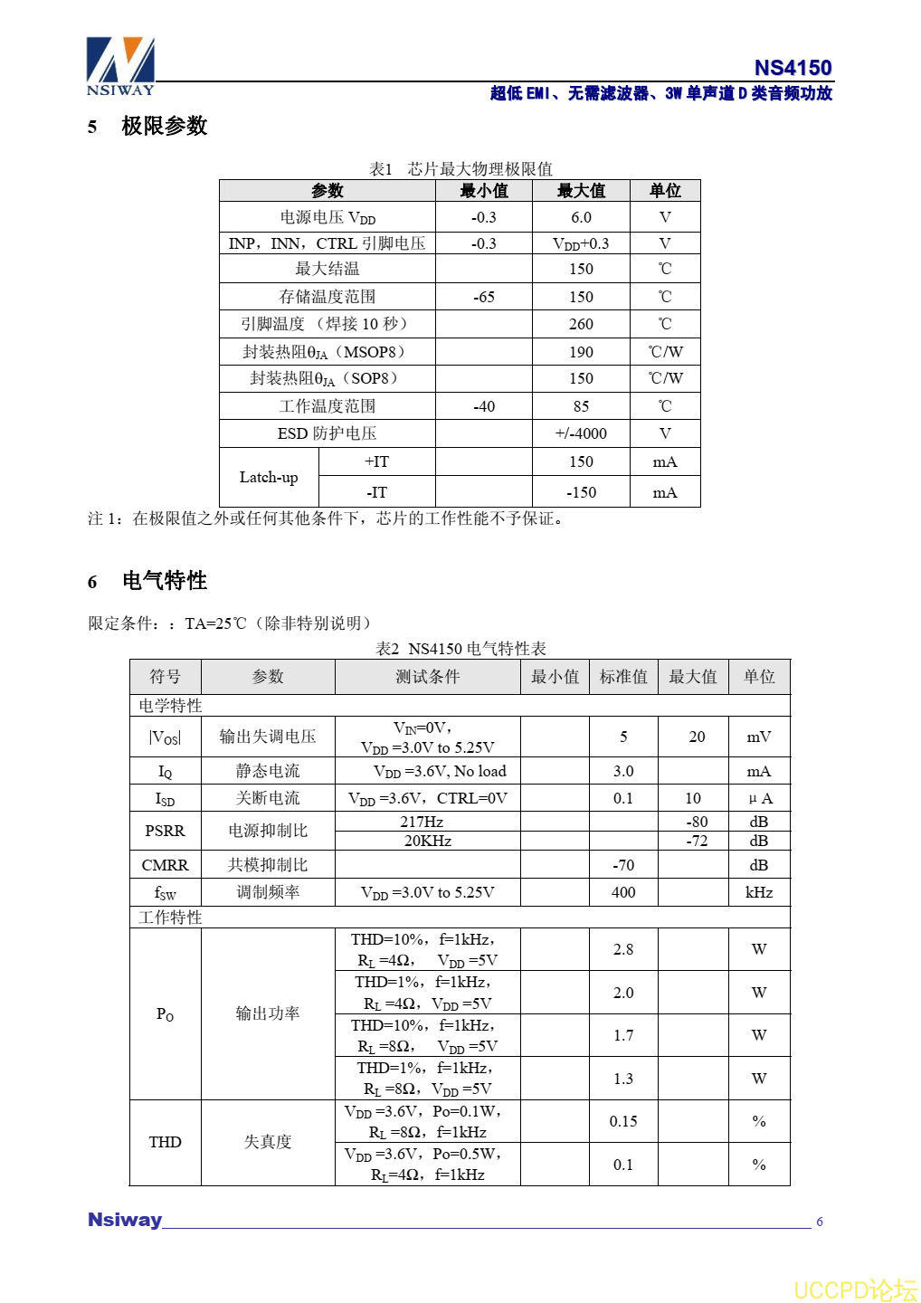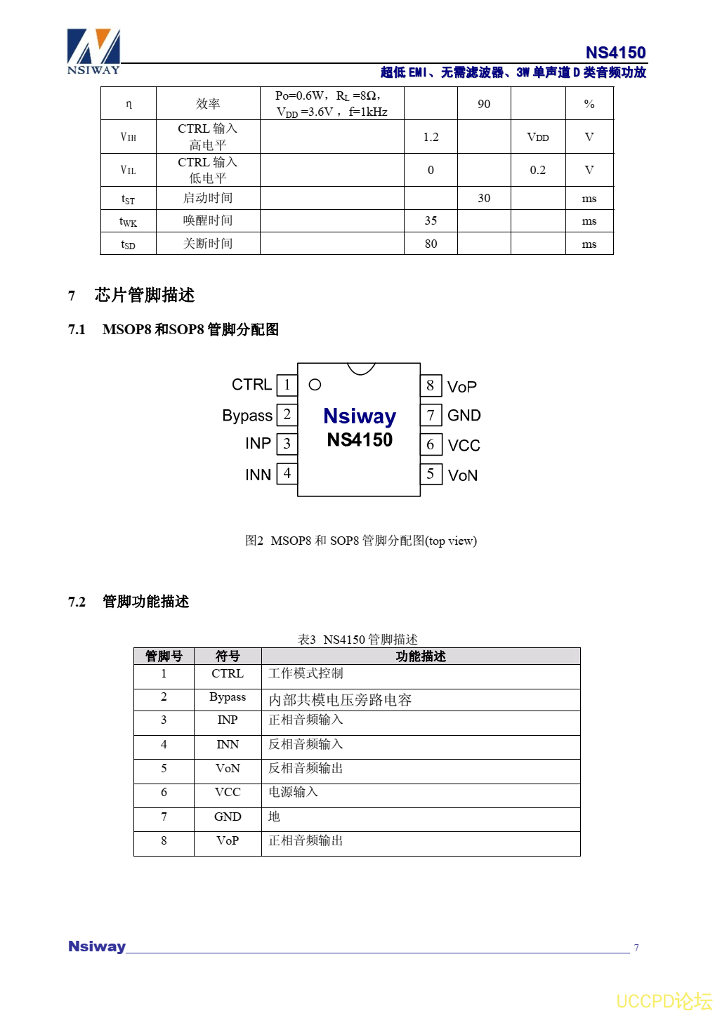 NS4150 提供 MSOP8 和 SOP8 封裝,額定的工作溫度範圍爲-40℃至 85℃。
