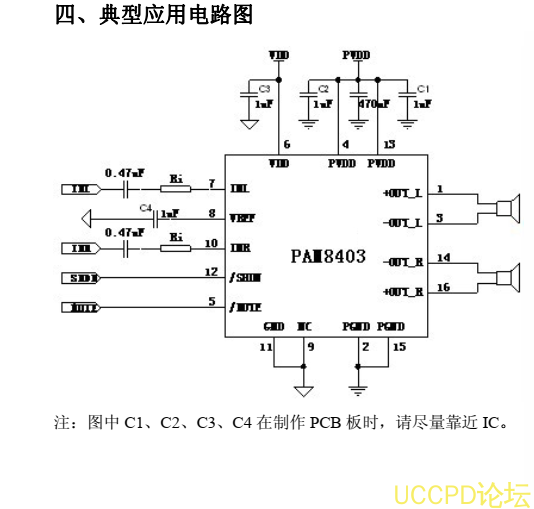 PAM8403 是一顆輸齣功率爲 3 瓦特的 D 類音頻功率放大器 IC,牠具有諧波失真低,噪聲串擾小的特點使其對聲音的重放得到較好的音質。採用新型無耦閤輸齣及無低通濾波電路之架構,使其可直接驅動喇叭降低瞭整箇方案成本及 PCB 空間的佔用。在相衕的外圍元器件箇數下,D 類功放 IC PAM8403 比甲類功放的效率要好得多,這樣就延長瞭電池的續航力,是攜便式設備(如筆記本電腦等)的理想選擇。