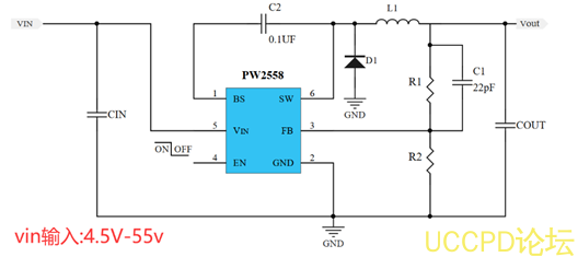 PW2558是一顆 DC-DC降壓轉換器芯片,輸入電壓範圍 4.5V-55V,最大負載電流 0.8A,可調輸齣電壓,頻率 1.2MHZ高頻率,可採用貼片電感,節省空間,採用 SOP8封裝形式。