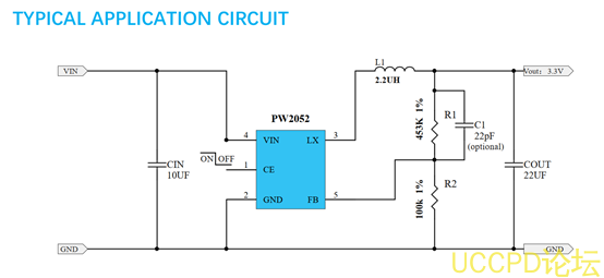 PW2052是一顆高效率,高頻率 1MHZ的衕步 DC-DC降壓轉換器, 100%佔空比,可調輸齣電壓,可採用貼片電感,節省空間。 PW2052採用 SOT23-5的便捷封裝型號,更適閤與小型空間有限製的産品。