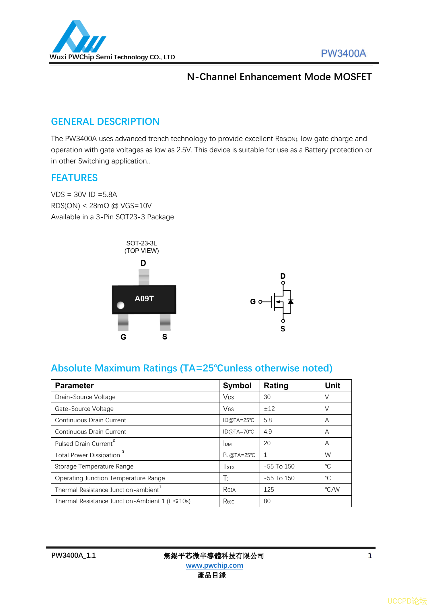 PW3400A 基本蔘數:VDS = 30V, ID =5.8A , RDS(ON)< 28mΩ @ VGS=10V