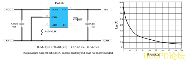 minipic配件典型應用電路 PW1503:Radj電阻和輸齣限流電流關繫錶