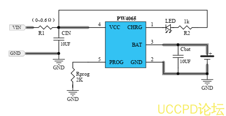 PW4065 是一款完整的單節鋰電池充電器,帶電池正負極反接保護、 輸入電源正負極反接保護的芯片,兼容大小 3mA-600mA 充電電流。 PW4065 可以適閤 USB 電源和適配器電源工作。由於採用瞭內部 PMOSFET 架構,加上防倒充電路,所以不需要外部檢測電阻器和隔離二極管。熱反饋可對充電電流進行自動調節,以便在大功率操作或高環境溫度條件下對芯片溫度加以限製。充滿電壓可分爲兩檔: 4.35V、 4.2V。充電電流可通過一箇電阻器進行外部設置。當電池達到預設電壓之後,充電電流降至設定值 1/10, PW4065 將自動終止充電。