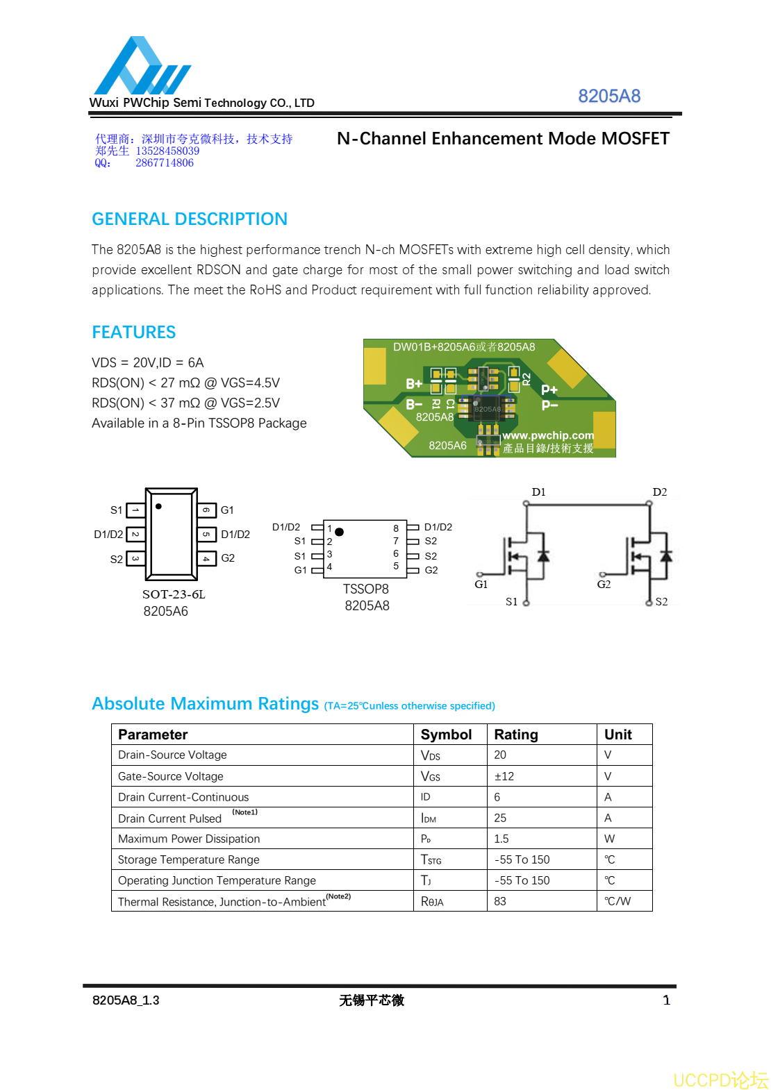 8205A8採用先進的溝槽技術,高密度,低導通電阻,是一箇非常有效和可靠的 MOS管裝置。 8205A8是一顆雙 N溝道的低內阻場效應 MOS管。雙 MOS的 D極內部是連接在一起的。 8205A5採用 SOT23-6封裝。