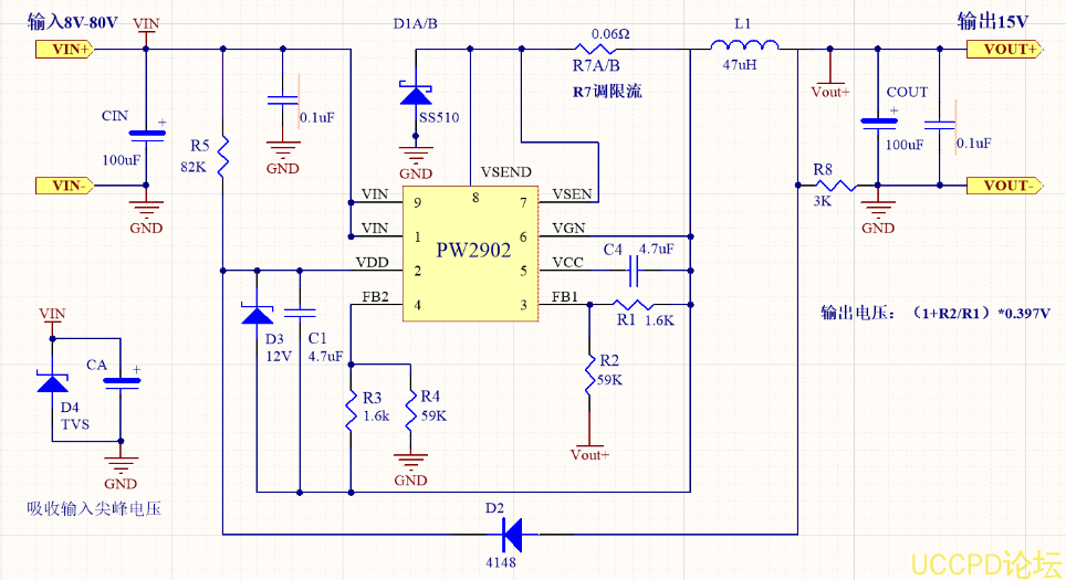 PW2902是一颗 DC-DC降压转换器芯片,输入电压范围 8V-90V,可负载 2A,可调输出电压,频率 140kHZ。适用于输出 12V2A或者 5V2A,可调输出电压 5V-30V之间。