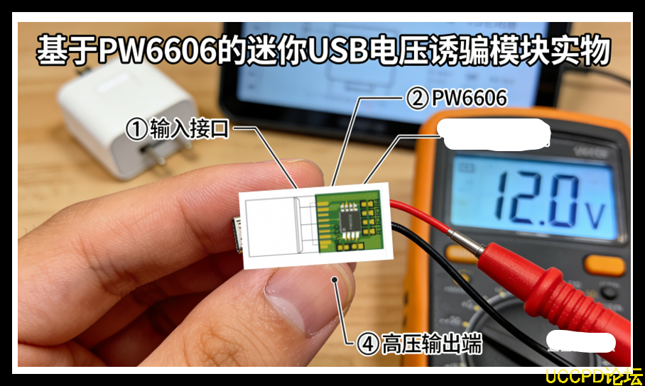 1. DIY快充转接头/线:电子爱好者最热衷的应用。将一个PW6606电路板嵌入USB-A或Type-C接头中,即可自制一个“5V转12V”的诱骗线,用于给便携显示器、旧款移动硬盘等设备供电。
