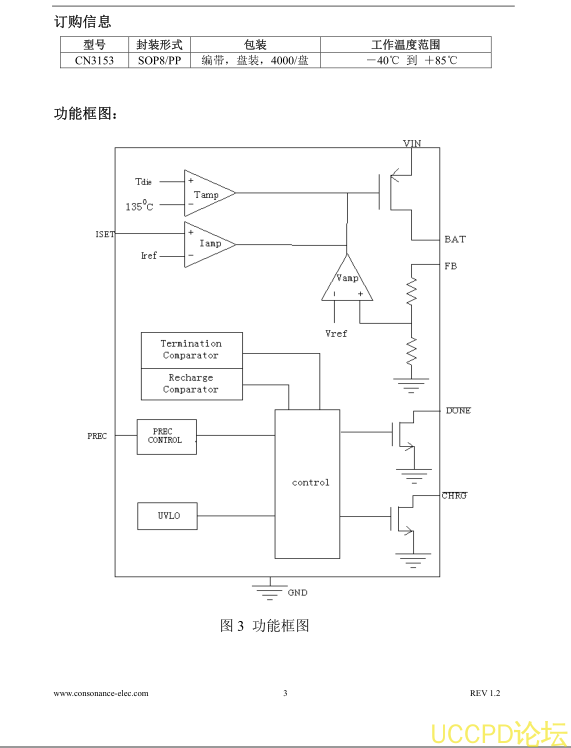 管。CN3153只需要极少的外围元器件,非常适合于便携式应用的领域。热调制电路可以在器件的功耗比较大或者环境温度比较高的时候将芯片温度控制在安全范围内。恒压充电电压可以通过一个外部的电阻调节。充电电流通过一个外部电阻设置。在电池电压较低时,CN3153处于涓流充电模式,涓流充电电流可选择为恒流充电电流的10%或100%。当输入电压掉电时,CN3153自动进入低功耗的睡眠模式,此时电池的电流消耗小于3微安。其它功能包括电池短路保护,输入电压过低锁存,自动再充电,充电状态/充电结束状态指示等功能。