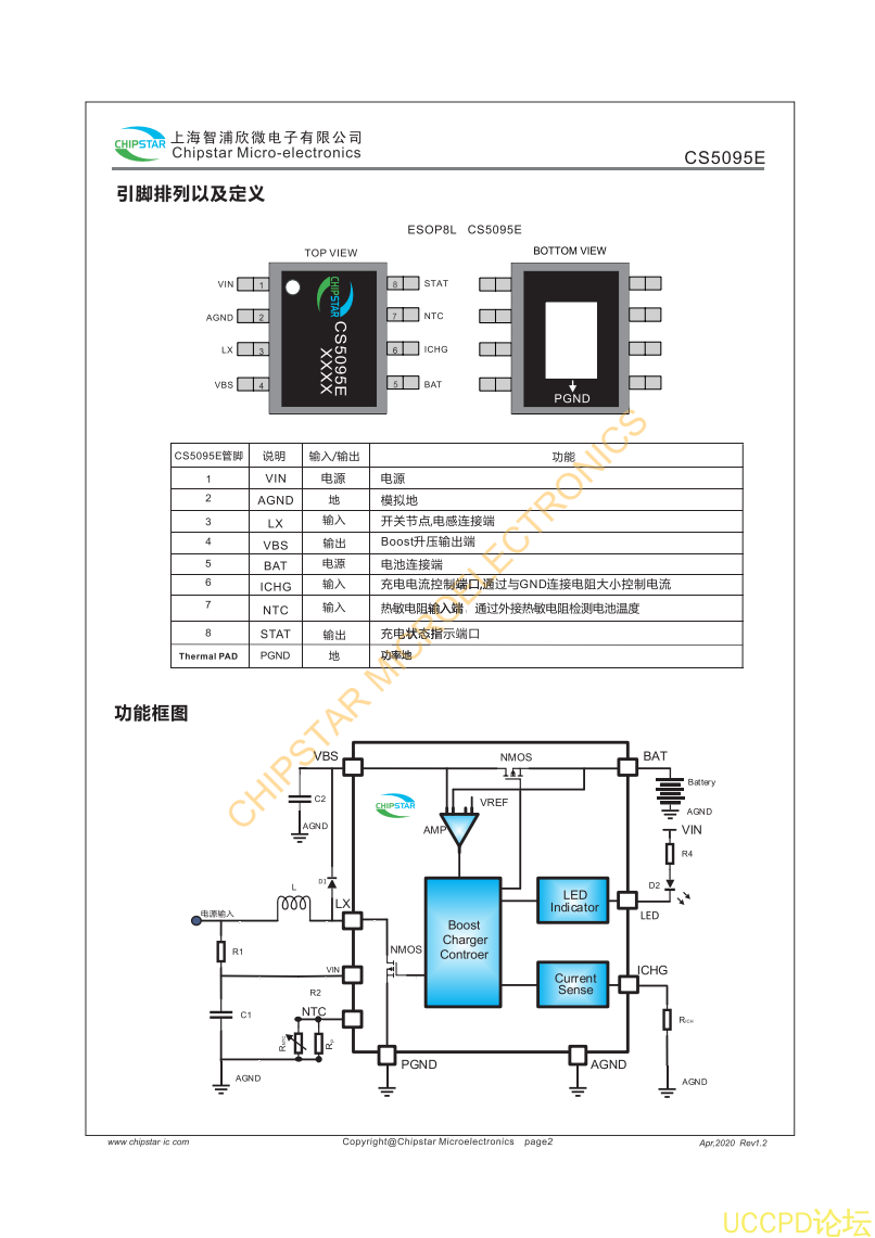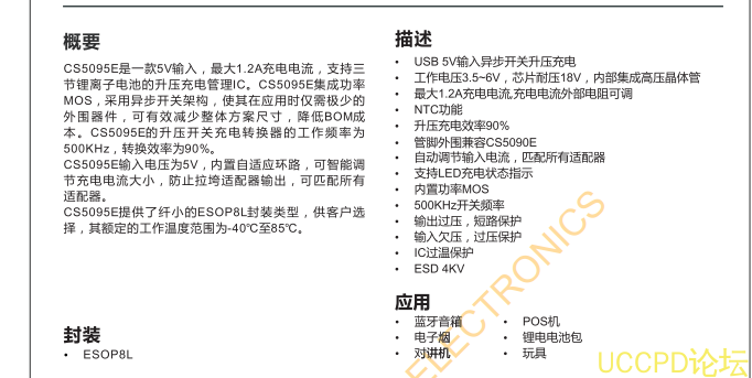 CS5095E是一款5V输入,最大1.2A充电电流,支持三节锂离子电池的升压充电管理IC,CS5095E集成功率MOS, 采用异步开关架构, 使其在应用时仅需极少的外围器件, 可有效减少整体方案尺寸, 降低BOM成本,CS5095E的升压开关充电转换器的工作频率为 500KHz, 转换效率为90%。