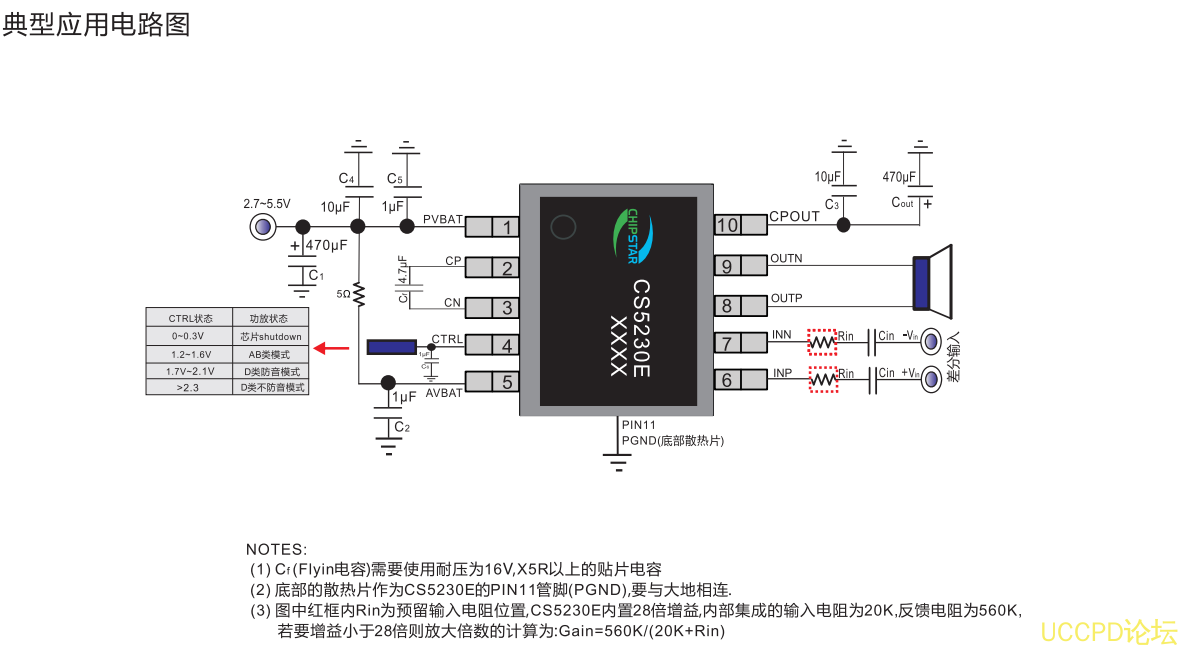 CS5230E是一款采用CMOS工艺电容式升压型GF类单声道音频功放,可以为4的负载提供最高5W的连续功率;CS5230E芯片内部固定的28倍增益,有效的减少了外围元器件的数量;功放集成了D类和AB类两种工作模式即可保证D类模式下强劲的功率输出又可兼顾系统在有FM的情况下消除功放对系统的干扰;CS5230E具有独特的防破音(NCN)功能可根据输出信号的大小自动调整功放的增益,实现更加舒适的听觉感受CS5230E还具备电源自适应能力当电源电压低的时候功放会自动降低增益从而减少功放的输出功率.
