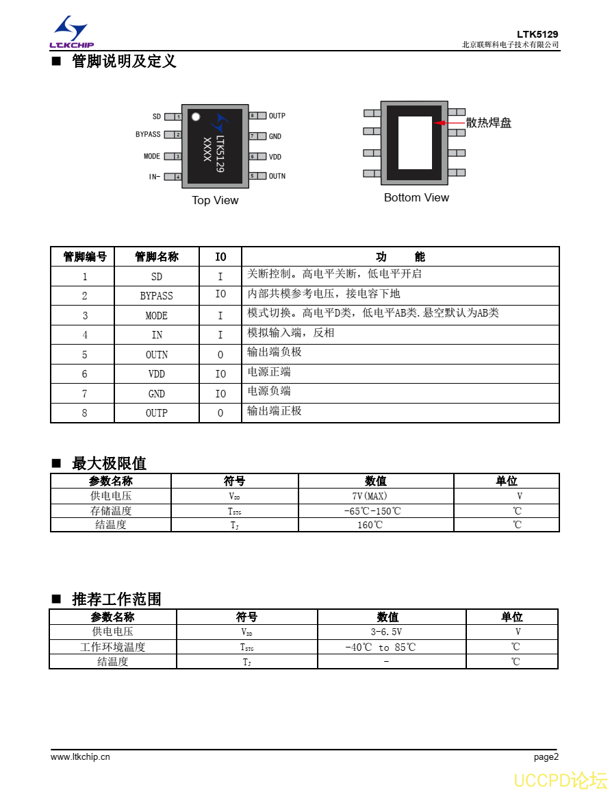 LTK5129 是一款 2Ω-10W 、4Ω-6.3W、单声道 F类音频功率放大器。LTK5129 采用高耐压工艺,耐压可达 7V, 同时对内部电路等方面进行优化,及大程度的提高输出功率。LTK5129 通过一个MODE 管脚可以方便地切换为 AB 类模式,完全消除 EMI 干扰。在 D 类放大器模式下可以提供高于90%的效率,新型的无滤波器结构可以省去传统D 类放大器的输低通滤波器,LTK5129 独有的DRC(Dynamic range control)技术,降低了大功率输出时,由于波形切顶带来的失真,相比同类产品,动态反应更加出色。LTK5129 采用ESOP-8 封装。