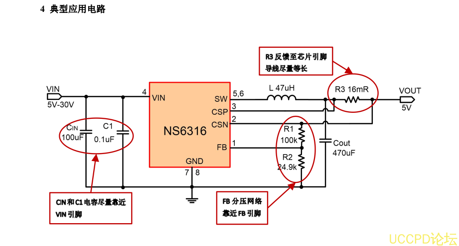 NS6316 内置线电压补偿,可通过调节 FB 端口的分压电阻阻值来实现。NS6316 不仅可实现单芯片降压电源管理方案,还可以与 QC2.0/ QC3.0 识别芯片构成快速充电电源管理方案。另外,芯片包含多重保护功能:过温保护,输出短路保护和输入欠压/过压保护等。