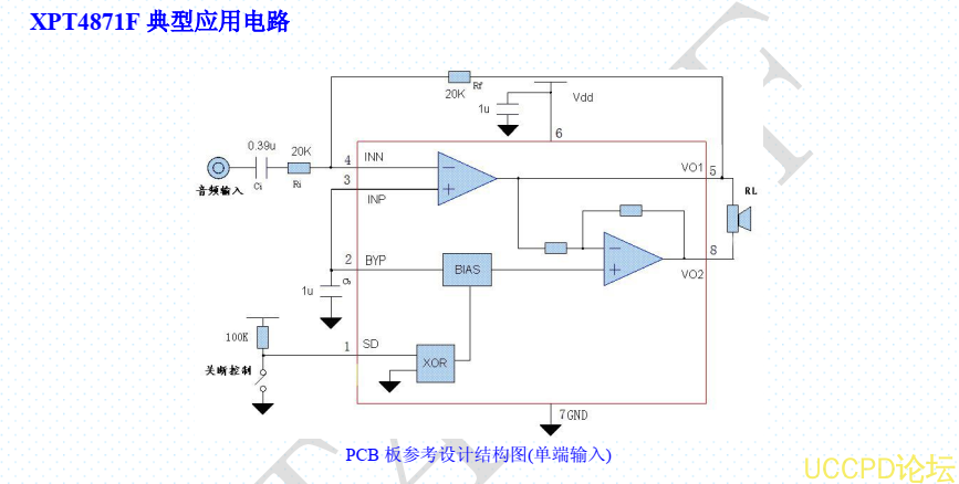 XPT4871F 的应用电路简单,只需极少数外围器件;XPT4871F 输出不需要外接耦合电容或上举电容,采用 SOP、ESOP 封装,节约电路面积,非常适合移动电话及各种移动设备等使用低电压、低功耗应用方案上使用。