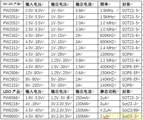 18V常降压转成 5V电压, 3.3V电压和 3V电压给其他芯片或设备供电,适用于这个电压的 DC-DC很多, LDO也是有可以选择的。 LDO芯片如 PW6206, PW8600等。 DC-DC芯片如: PW2162,PW2312,PW2330等等很多选择。如下表