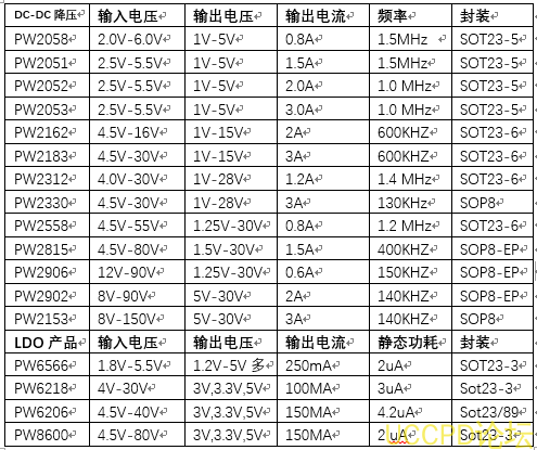 根据上面表格, 36V输入我们可以选择: PW2558,PW2906,PW2902,PW2153均可,再按找工程师其他要求确定最终的一个型号。
