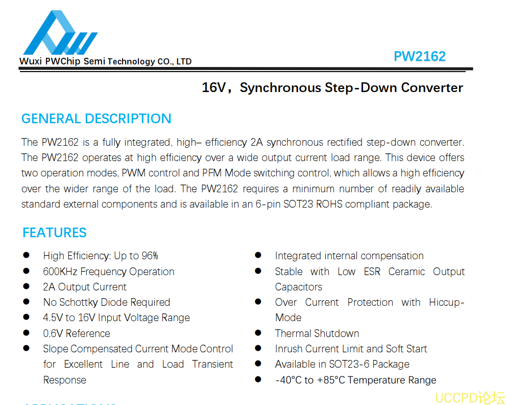 PW2162 是一颗高效率,高集成的 2A 同步整流降压转换器, PW2162 可在宽输入电压范围工作: 4.5V-16V ,可调输出电压,内部集成了 MOS 管整流,节省了外部肖特基二极管,效率也得到提高。