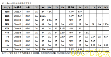 JD6606S支持高通的 QC2.0/3.0/3+充电协议,可藉由表 1. RPDO电阻和功率输出设置表选择 Class A或 Class B的电压输出范围。 QC 2.0模式输出电压提供 A类规格 (5V/9V/12V)、 B类规格 (5V/9V/12V/20V)的电压选择, QC 3.0连续模式输出电压提供 A类规格 (3.6V至 12V)、 B类规格 (3.6V至 20V),电压调整每步阶电压 200mV, QC 3.0+连续模式输出每步阶电压 20mV。