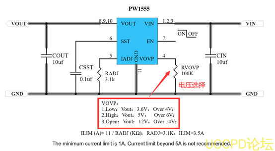 PW1555可选三个输入电压挡位: 3.6V, 5V, 12V( 9-13V范围),由 4脚选择输入 25V左右时,输出电压控制最高 12.92V,直到输入电压降到 12.92V以下时,输出电压跟输入电压一致。