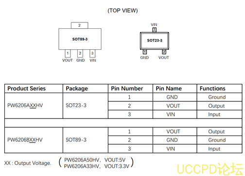 PW6206调节器有标准SOT89-3L和SOT23-3L封装。标准产品无铅无卤。