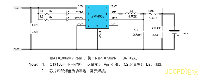 PW4052 采用三段式充电管理,当电池电压低于 2.9V(Typ)时,采用涓流模式充电, 充电电流为满充电流的 2/10(Typ) ;当电池电压高于 2.9V(Typ)时,采用全电流充电, 充电电流由外部的 SENSE 电阻设定;当电池接近浮充电压时, 采用恒压充电,充电电流逐渐减小; 当充电电流减小至 2/10(Typ)电流时, 充电完成;如果电池电压降低至再充电电压 4.05V(Typ)时, PW4052 会再次重启充电; 当去掉输入电源时,芯片自动进入休眠模式, 电池的漏电电流降至 2uA(Typ) 。