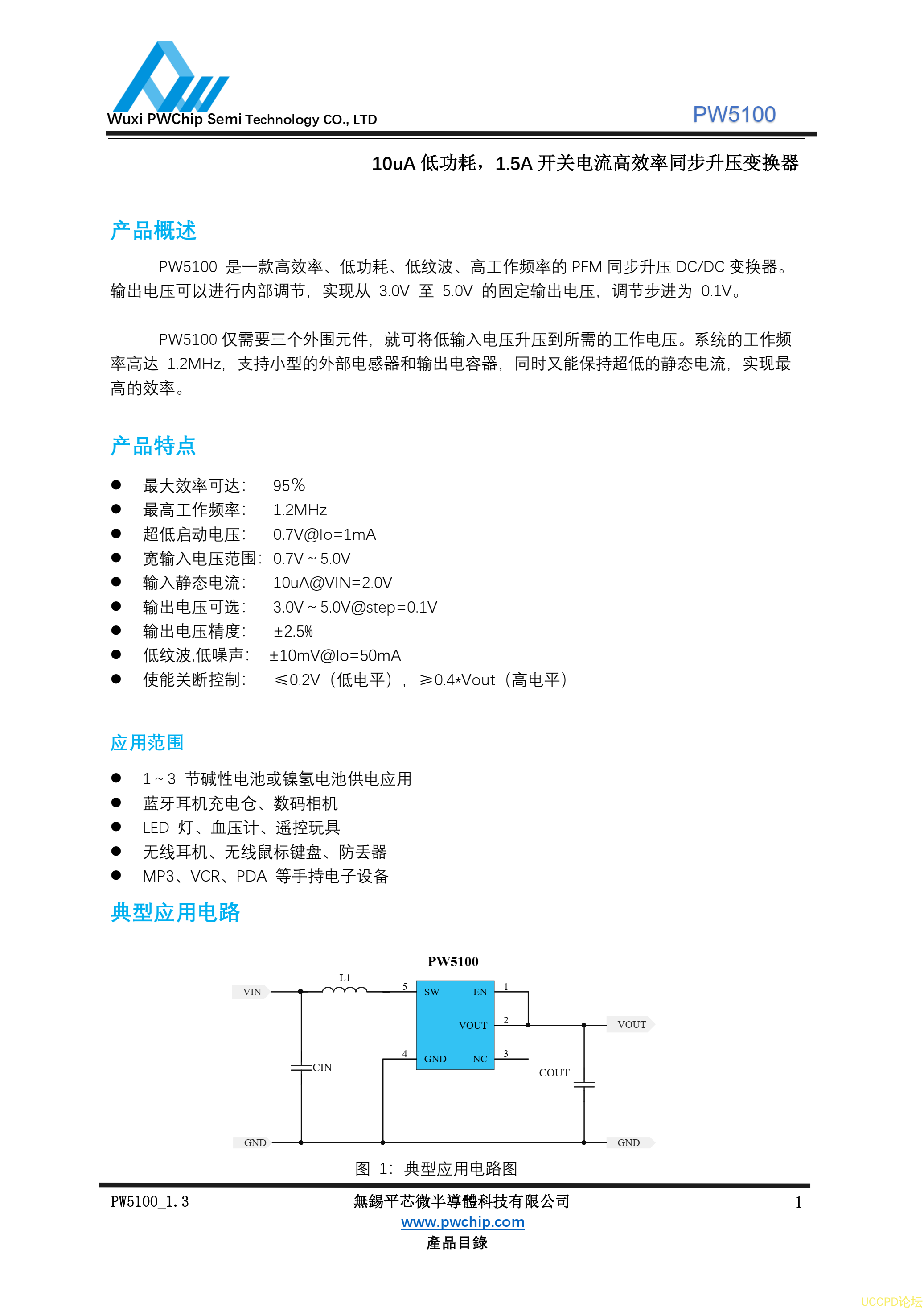 PW5100 是一款高效率、低功耗、低纹波、高工作频率的 PFM 同步升压 DC/DC 变换器。