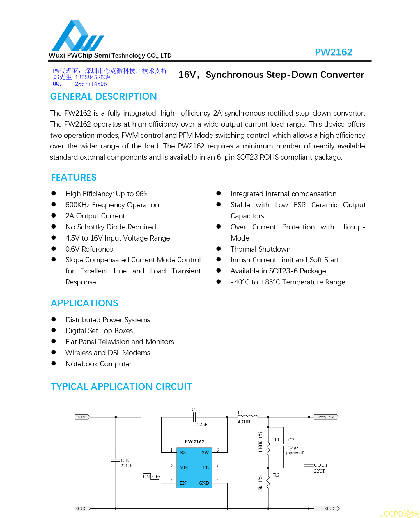 PW2162是一颗 DC-DC同步降压转换器芯片,输入电压范围 4.5V-16V,最大负载电流 2A,可调输出电压,频率 600kHZ高频率,可采用贴片电感,节省空间,采用 SOT23-6封装形式。