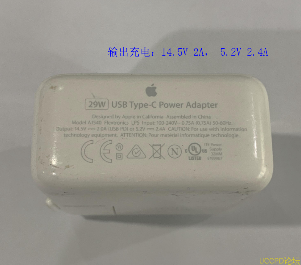 29W的USB C充电器是什么时候出来的我不太记得了,但是是苹果出的最早的USB C充电器了。我自己手上就有一个,已经很久了。输出充电是:14.5V 2A 和5.2V 2.4A的规格。