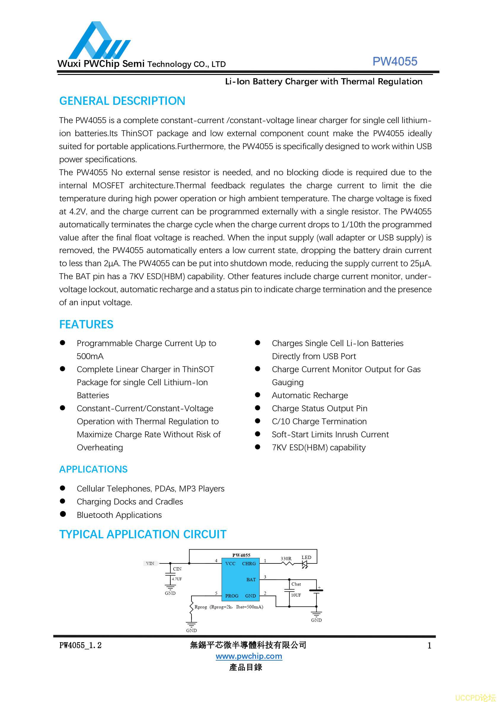 The PW4055is a complete constant-current /constant-voltage linear charger for single celllithium-ion batteries.Its ThinSOT package and low external component count makethe PW4055 ideally suited for portable applications.Furthermore, the PW4055 isspecifically designed to work within USB power specifications.