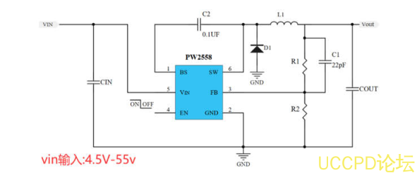 PW2558 是一颗 DC-DC 降压降压换器芯片,输入电压范围 4.5V-55V,最大负载电流