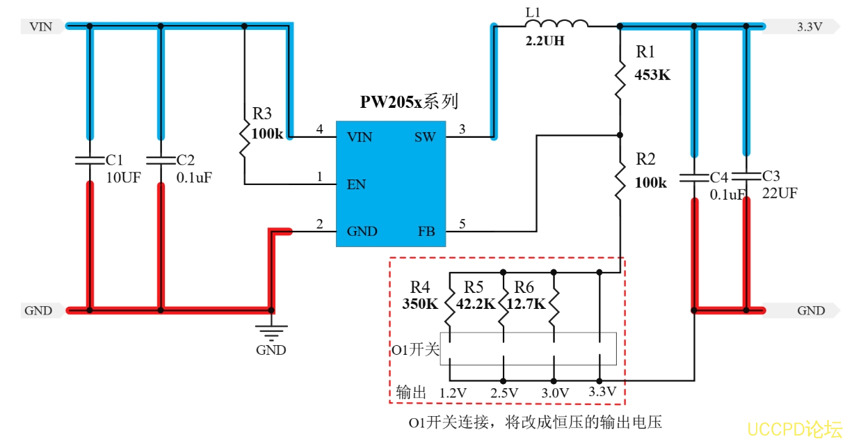 PW2058 输入电压 2V~ 6V, 可通过 R1,R2 设置恒压输出电压值, 电流可高达 0.8A, 封装 SOT23-5。