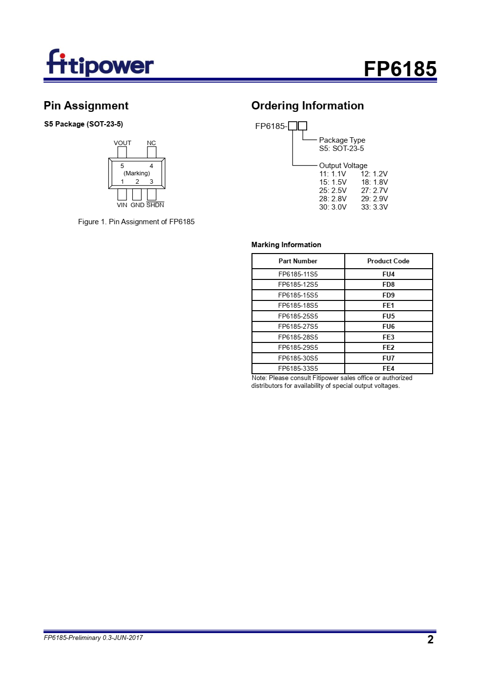 The FP6185 offers high precision output voltage of2%.The FP6185 is available in SOT-23-5 package which features small size.