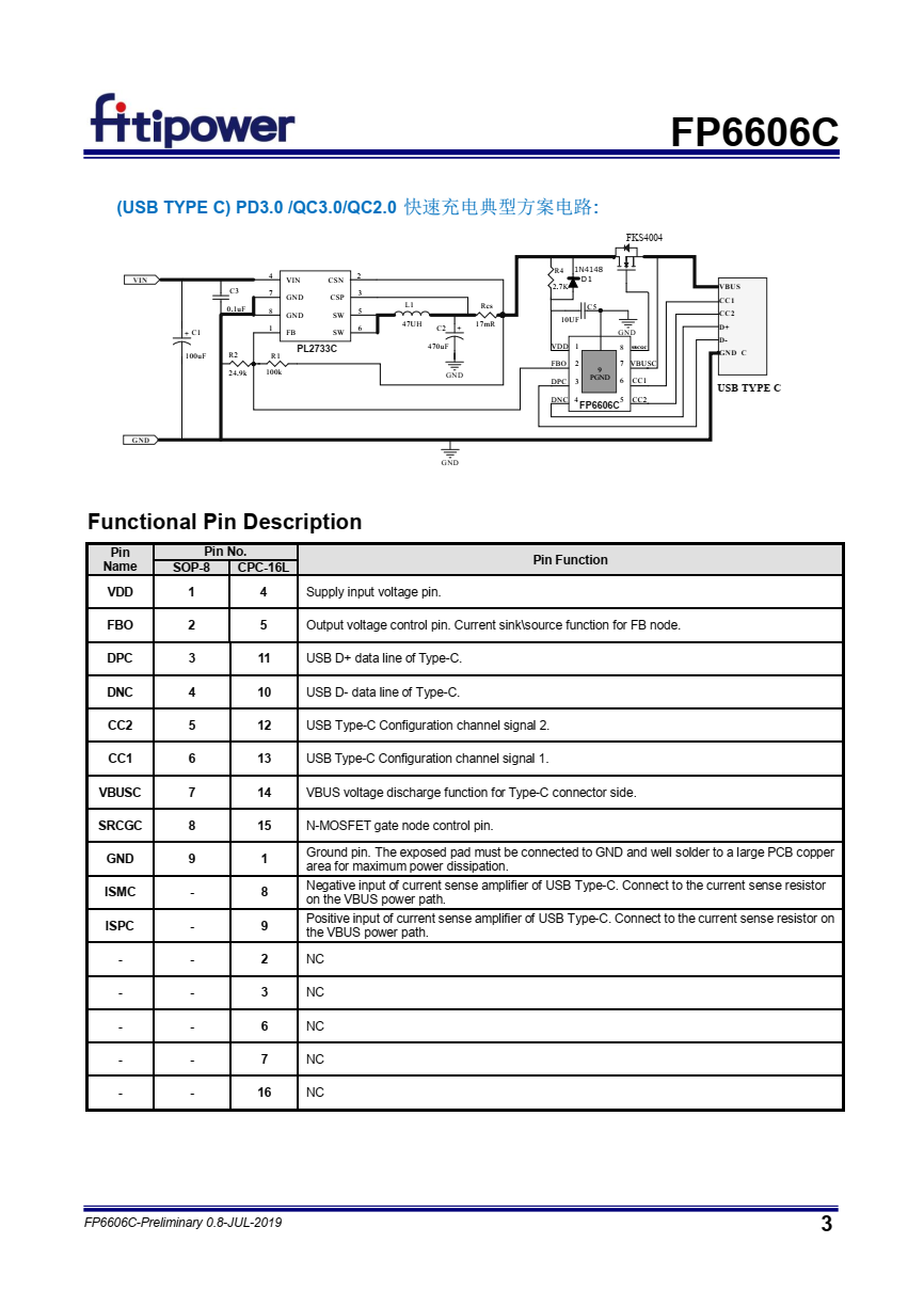 The FP6606C is a simplified USB Power Delivery 3.0 protocol controller. It also integrated functions for HiSilicon Fast Charging Protocol (FCP) and Qualcomm Quick Charge 2.0/3.0.
