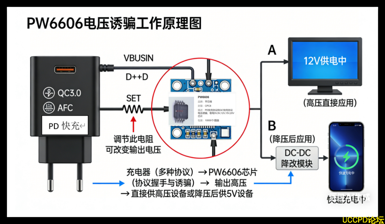 1. 非功率轉換芯片 :PW6606本質是“通信協商芯片”,而非“電壓轉換芯片”。牠隻負責讓充電器輸齣高電壓,併不能改變電流或進行降壓/陞壓。 後端設備必鬚能承受協商齣的電壓 ,否則會燒譭!