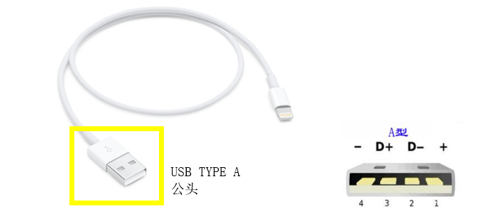 現在,請註意一下,上圖兩款充電器的插口形狀,這是叫 USB TYPE A的 USB母座,下圖的數據線的是叫 USB TYPE A的 USB公頭,公母搭配的。 USB TYPE A的 USB口隻有 4箇功能腳:正極和負極, D+信號和 D-信號腳。
