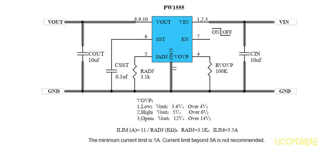 PW1555 is a programmable current limit switch with input voltage range selection and output