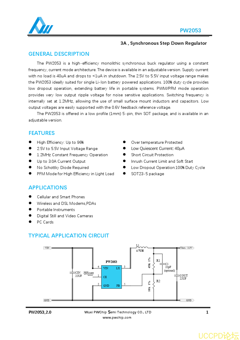 The PW2053 is a high-efficiency monolithic synchronous buck regulator using a constant