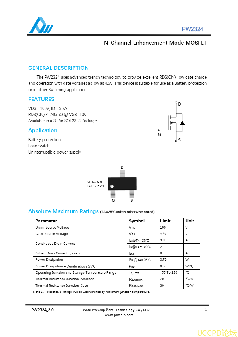 The PW2324 uses advanced trench technology to provide excellent RDS(ON), low gate charge